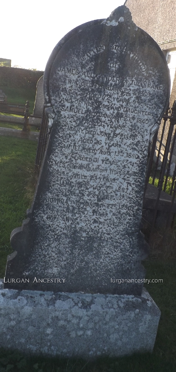 Erected in memory of James Alexander of Tullyrane who died 22 Feb 1869 aged 72 years. And of his sons and daughters:- Samuel died 23 Jan 1840 aged 6 years; Mary died 19 Jun 1859 aged 26 years, Samuel died 13 Aug 1880 aged 31 years; James died at Beaufort West, S.A. 1859 aged 23 years; Jane died 03 May 1887 aged 43 years; Joshua died 02 Jan 1890 aged 67 years. His wife Anne died 02 Jan 1892 aged 85 years.